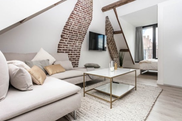 De woonkamer is modern en sfeervol ingericht, met een comfortabele loungehoek en grote televisie. De open keuken is een echte eyecatcher, uitgerust met diverse inbouwapparatuur, een spoeleiland en een aanrechtblad van natuursteen – perfect voor wie houdt van design én gebruiksgemak. Aan de rustige achterzijde bevindt zich de slaapkamer met een tweepersoonsbed en een handige inbouwkastenwand. Vanuit de slaapkamer heeft u directe toegang tot het privéterras (ca. 10 m²) – een heerlijke plek om te ontspannen na een drukke dag in de stad. De luxe badkamer beschikt over een inloopdouche, modern badkamermeubel en toilet. Geen studenten