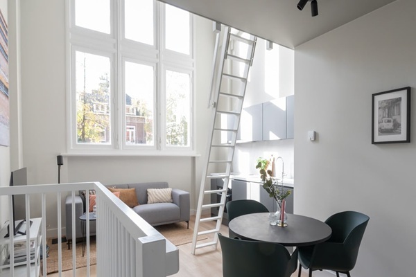 De moderne, open keuken is ideaal voor het bereiden van uw favoriete maaltijden terwijl u in de woonkamer met de gasten bezig blijft. Hij heeft een strak donker design met een contrasterend wit aanrechtblad, compleet met inductiekookplaat, koelkast met vriesvak, vaatwasser en afzuigkap. De ronde eettafel maximaliseert de ruimte, waardoor hij perfect is voor bijeenkomsten. Boven biedt de mezzanine een speciale studeerruimte, terwijl de keldersuite de gezellige slaapkamer herbergt, bereikbaar via een trap. De privébadkamer is een rustig toevluchtsoord met een grote douche met glazen deur, een wastafel en rustgevende beige tegels. Ideaal voor (uitwisselings)studenten, expats en professionals die tijdelijk woonruimte nodig hebben vanwege woningrenovatie, verkoop, relatiewijzigingen, stages of kortdurende werkopdrachten in of rond Nijmegen.