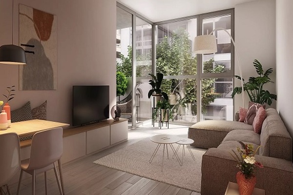 Woonkamer en keuken Dit moderne 2-kamerappartement ligt op de vierde verdieping van het iconische g...