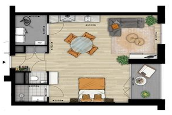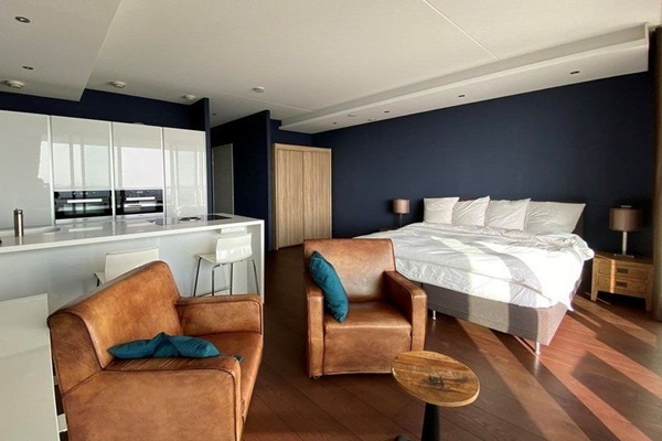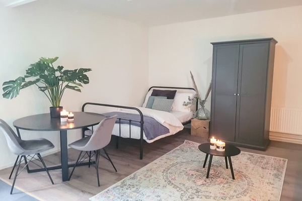 De studio is efficiënt en prettig ingedeeld, met een eigen keuken, een badkamer met douche en toilet...