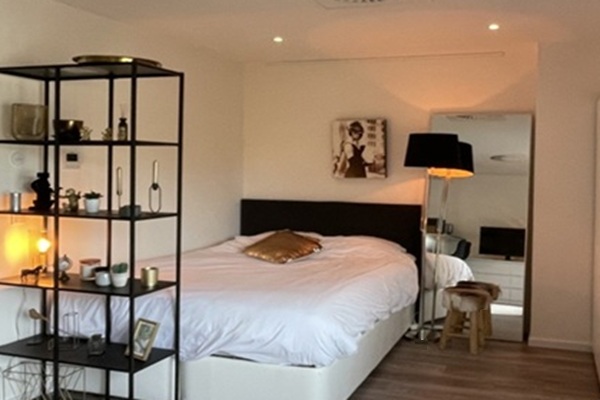 De studio is circa 22 m² en combineert slaap- en woonruimte met een kitchenette en een eigen inloopd...