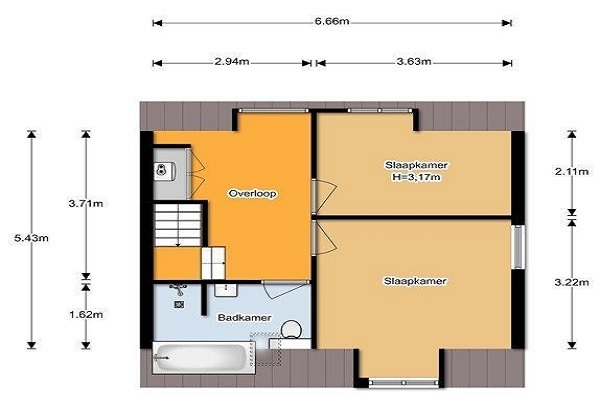 Indeling Entree/hal met ruime kapstok en toegang naar. De ruime en lichte woonkamer met open moderne keuken voorzien van inbouw apparatuur te weten: vaatwasser, koelkast vriezer, combi-oven Woonkamer en keuken hebben een mooie houten vloer. Vanuit de woonkamer is er toegang tot kleine hal met zwevend toilet en bergruimte. De open trap naar boven verdieping geeft een mooi plaatje. Zeer ruime overloop, welke is ingericht als werkruimte met een buro Mooie slaapkamers (zijn er 2) aan de voorzijde voorzien van gestuukte wanden, inbouwspots, houten vloer, Hier is ook de aansluiting voor de wasmachine en de CV ketel. Moderne nieuwe badkamer voorzien van inloop-douche, 2e zwevend toilet, wastafelmeubel en ook nog een ligbad.