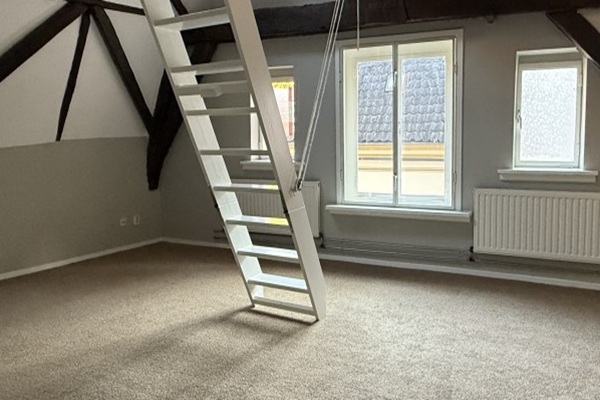 Indeling Ruimte hal, apart toilet, royale woonkamer van maar liefst 50 m². De open keuken is modern ingericht en voorzien van veel kastruimte en alle benodigde inbouwapparatuur: een kookplaat, afzuigkap, koelkast met vriesvak, combimagnetron en een vaatwasser. De royale slaapkamer met authentieke gebinten van circa 25 m² beschikt over een sfeervolle vide, ideaal om als slaapruimte te gebruiken en zo de benedenruimte optimaal te benutten. Dit complex heeft een gemeenschappelijk dakterras.