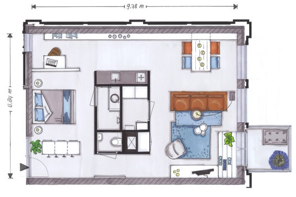 Indeling: Een industriële loft waarbij een unit middenin is geplaatst met daarin de keuken welke voorzien is van een RVS spoelbak, keramische kookplaat, koelkast met vriesvak, combi magnetron en vaatwasser. Verder bestaat de unit uit een badkamer met douche, vaste wastafel en designradiator, een apart toilet met fontein en tevens bevindt zich hier ook een berging met aansluiting voor de wasmachine/condensdroger en de meterkast.