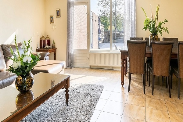 Indeling Parkeren voor de deur. Entree van de woning in hal met toilet en trap. Deuren naar de woonkamer en keuken. De woonkamer heeft openslaande deuren naar de ruime tuin van ca. 100m2. De keuken is voorzien van inbouwapparatuur zoals een vaatwasser, vriezer/koelkast, kookplaat, spoelbak, oven, magnetron en voldoende opbergruimte. Op de eerste verdieping bevinden zich de 3 ruime slaapkamers en een badkamer met bad en toilet, wastafel en handdoekradiator. Trap naar de 2e verdieping met een grote open ruimte en een ruimte voor de wasmachine. Een vierde slaapkamer met douchecabine. Op deze verdieping bevindt zich ook het terras.