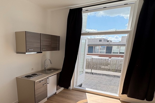 De woning is volledig gestoffeerd en deels gemeubileerd en beschikt over een lichte woonkamer met open keuken, een moderne badkamer en een ruime slaapkamer. Zowel de woonkamer als de slaapkamer bieden toegang tot het grote dakterras, ideaal voor zonnige dagen en buiten eten. Deze comfortabele woning is bij uitstek geschikt voor een werkende alleenstaande die op zoek is naar een nette woonruimte met veel buitenruimte en een centrale ligging. INDELING •Eerste verdieping: entree, hal met toegang tot de badkamer voorzien van toilet, wastafel en douche. •Woonkamer met open keuken en deur naar het zonnige dakterras. Slaapkamer, eveneens met directe toegang tot het terras. •De woning is in 2025 volledig gerenoveerd en voorzien van een moderne afwerking. Geschikt voor: maximaal 1 persoon!