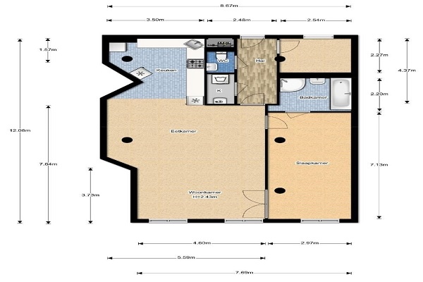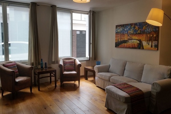Indeling Goed onderhouden gemeenschappelijke entree met bellentableau en brievenbussen, hal, entree appartement, hal, kleine slaapkamer, toilet en kast met wasmachine, droger en stadsverwarming. Ruime woon-/eetkamer met open keuken, volledig uitgerust, grote slaapkamer met ensuite badkamer met bad en douche. Tweede slaapkamer kan gebruikt worden als studeerkamer of logeerkamer. In de kelder bevinden zich een eigen berging en een gemeenschappelijke fietsenstalling.