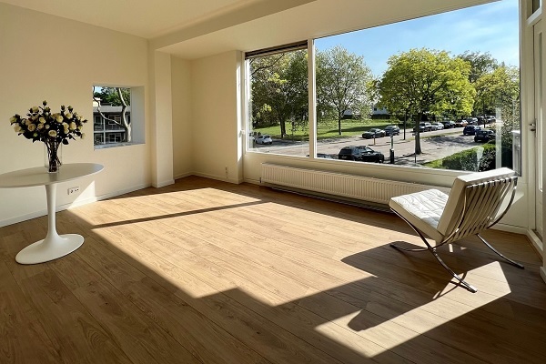 Indeling entree, ruime hal v.v. bergkast, moderne toiletruimte v.v. wandcloset en fontein, een aparte kast met de CV-installatie. Brede en lichte woon-/eetkamer (3.11/4.20 x 9.38/5.39, incl. keuken) v.v. grote raampartijen met een prachtig uitzicht over de gemeenschappelijke tuin en het groen van de Bergse Plas. De luxe open keuken is v.v. koel-/vriescombinatie, ingebouwde wasmachine, vaatwasser, combi-oven/magnetron, keramische kookplaat, afzuigkap corner. Vanuit de woon-/eetkamer toegang tot het op het zuidwesten gelegen balkon (1.56 x 3.93m). De 2 slaapkamers (3.48 x 3.73m en 3.48 x 4.44m) zijn gelegen a/d achterzijde van het appartement en hebben beide toegang tot het op het noordoosten gelegen balkon (1.00 x 8.39m), de grootste slaapkamer heeft een vaste kastenwand. Luxe geheel betegelde badkamer (1.85 x 1.83m) v.v. douchehoek, wastafelmeubel en handdoekradiator. Afzonderlijk toilet. In het gehele appartement ligt een fraaie brede delen laminaatvloer. Alle ramen zijn v.v. dubbelglas, de gevels zijn geisoleerd en er is een nieuwe CV installatie. Berging in de onderbouw (3.06 x 2.05m) Bewoning is mogelijk voor maximaal 2 personen, een stel Young Professionals