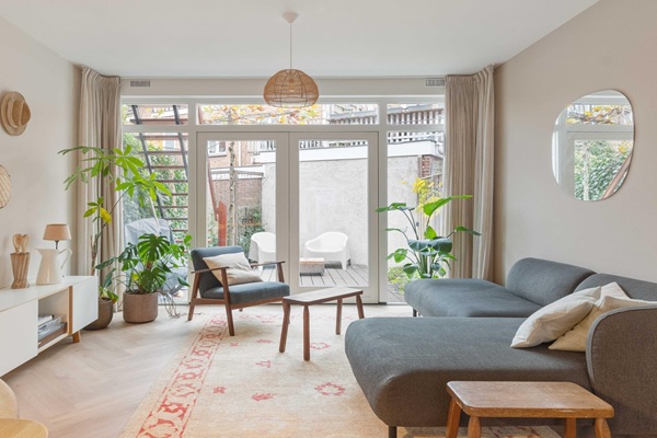 INDELING Je komt de woning binnen in een hal waar het toilet zit, de trapopgang naar de eerste verdieping en de toegang tot de woonkamer. In de woonkamer bevindt zich de open keuken die is uitgevoerd in een warme groene kleur met een eiken fineerblad. Verder is de keuken voorzien van een inductie kookplaat met bijpassende design wasemkap, een combimagnetron, rvs-spoelbak met Quooker kraan en een vaatwasser. Op de gehele benedenverdieping ligt een pvc-visgraat vloer in een naturel eiken kleur. De muren hebben een warme zandkleur die ook weer terugkomt in het zorgvuldig gekozen interieur. Via openslaande deuren loop je vanuit de woonkamer zo door de tuin in. Een net aangelegde stadstuin gelegen op het zuiden. Op de tweede verdieping bevinden zich twee slaapkamers, de badkamer en het washok. Aan de voorzijde van de woning bevinden zich de eerste slaapkamer met thuiswerk plek en de badkamer. Aan de achterzijde zit de master bedroom met toegang tot het dakterras. De kamer is erg sfeervol met de zichtbare balklaag in het plafond, de houten vensterbanken en het uitzicht op de houten pergola op het dakterras. Via het dakterras loop je via een trap zo naar beneden de tuin in. Geen woningdelers;