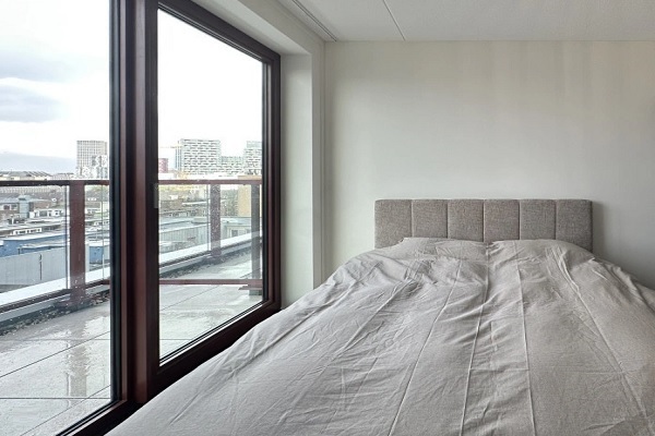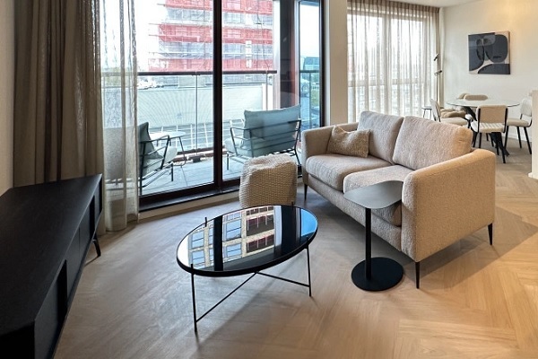 Indeling: Gemeenschappelijke entree op de begane grond met bellentableau, brievenbussen en toegang tot de lift en trap. Binnenkomst in een ruime hal met toegang tot de meterkasten, een separaat toilet en twee slaapkamers. Slaapkamer 1 is voorzien van een tweepersoonsbed, kledingkast en spiegel, en biedt toegang tot het balkon. Slaapkamer 2 is vrij in te richten en heeft ook toegang tot het balkon dat over de gehele breedte van het appartement loopt. De badkamer is modern en volledig betegeld, voorzien van een inloopdouche, handdoekradiator, wastafel met meubel en spiegel met verlichting. Daarnaast is er separaat hangend toilet met wastafel. Trap omhoog naar de woonkamer met open keuken, eetkamer en zithoek. De ruime eethoek heeft een ronde glazen tafel met 4 teddy stoelen, ideaal voor gezellig dineren. De zithoek is voorzien van een matchende, comfortabele tweepersoons teddy bank, tv-meubel en tv. De open keuken is uitgerust met zwarte kastjes, Siemens combi-oven, Siemens vaatwasser, een Bora afzuigsysteem, koelkast, vriezer, kookeiland en zitbar. Er is ook een handige opbergruimte naast de keuken, welke voorzien is van een Siemens wasmachine en droger. Het 2e balkon is toegankelijk vanuit de woonkamer, met een gezellige zitplek en ideaal voor het genieten van de avondzon. Er is ook een gezamenlijk dakterras op de 7e verdieping en een ruime gezamenlijke fietsenberging op de begane grond. Het is mogelijk om een aparte parkeerplaats te huren.