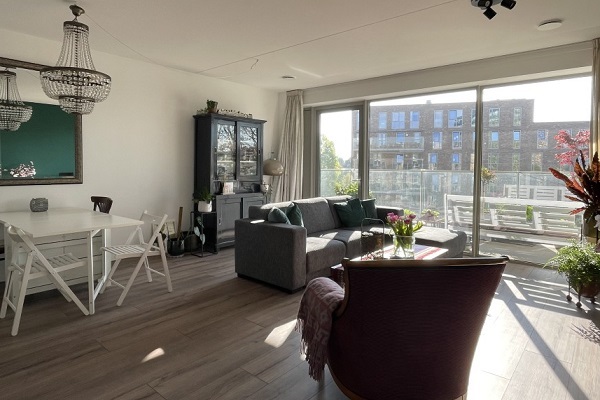 Dit ruime appartement ligt op de eerste verdieping van het complex. De moderne, witte keuken is voorzien van een koel-vriescombinatie, oven met magnetronfunctie, inductiekookplaat en vaatwasser. De badkamer heeft een inloopdouche en een dubbele wastafel met spiegel. Het toilet met fontein is apart. Vanuit de lichte woonkamer stap je zo het ruime balkon op. Daarnaast is er een grote berging binnen het appartement.