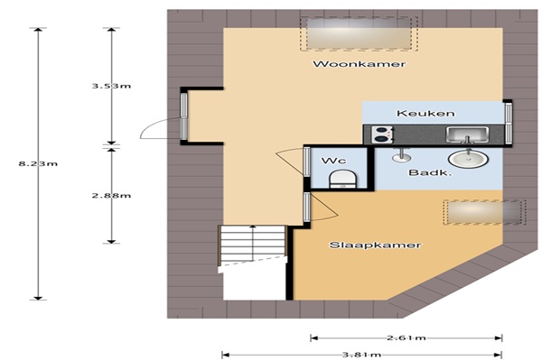 Bij binnenkomst via de entree komt u via een trap op de verdieping. Direct rechts bevindt zich de slaapkamer. De woonkamer heeft een open keuken en biedt toegang tot een balkon. De slaapkamer beschikt over een ensuite badkamer, modern en luxe afgewerkt, met inloopdouche en wastafel. Er is daarnaast een separaat toilet aanwezig.
