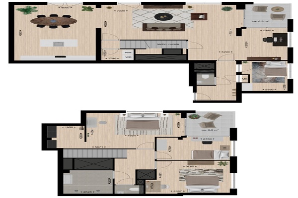 Via de entree betreed je de hal die je toegang biedt tot de riante woonkamer met (half)open Novitelli keuken voorzien van Whirlpool inbouwapparatuur en een heerlijk balkon. De ruime woonkamer biedt zeer veel indelingsmogelijkheden. Door de vele raampartijen beschik je over heel veel daglicht. Heerlijk thuiswerken in je appartement? Dat kan, want grenzend aan de woonkamer heb je de beschikking over een aparte kamer die perfect dienst kan doen als werkkamer. Via de trap vanuit het woongedeelte bereik je de verdieping. Op deze verdieping heb je nog drie slaapkamers een badkamer en een extra separaat toilet. Of misschien maak je liever van die extra slaapkamer een fijne inloopkast en werk je straks fijn vanuit huis in je werkkamer. Op deze verdieping is ook nog een tweede balkon te vinden – hoe uniek is dat!
