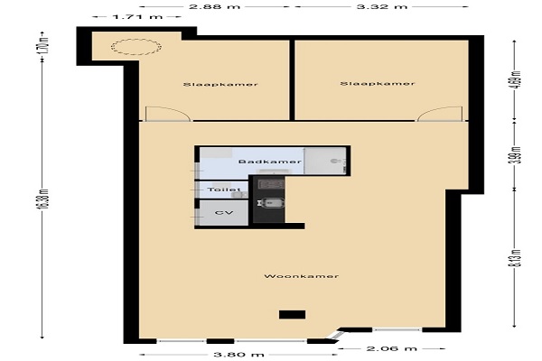 Indeling Het grootste deel van de woning wordt ingenomen door de woonkamer. Deze ruimte heeft een breedte van ca. 3,80 m aan de voorzijde en loopt door tot een diepte van ruim 16 meter. Er is een nis aan de rechterzijde, waardoor de ruimte een speelse vorm krijgt. De keuken is geïntegreerd in de woonkamer en bevindt zich in het midden van de woning. Deze is in een rechte opstelling geplaatst langs een wand, tegenover het toilet en de CV-ruimte. Het appartement heeft twee slaapkamers, beide gelegen aan de achterzijde van het appartement: -De linker slaapkamer meet ca. 2,88 m breed en 4,69 m diep. -De rechter slaapkamer is iets breder met ca. 3,32 m breed en 4,69 m diep. Beide kamers zijn bereikbaar via de woonkamer en hebben elk een eigen deur. De badkamer ligt centraal in de woning, naast de keuken. Deze ruimte is compact en praktisch ingedeeld. Het toilet is apart gesitueerd naast de badkamer. Naast het toilet bevindt zich een aparte ruimte voor de CV-installatie.