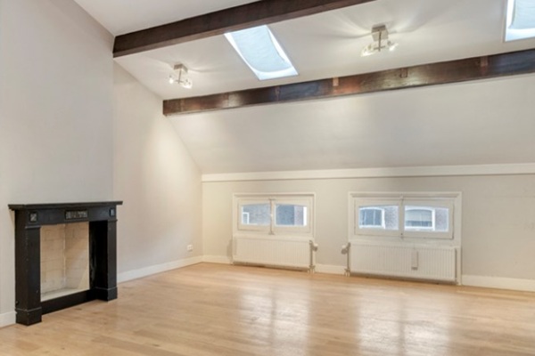 Indeling: Toegang; trap naar 2e (bovenste) verdieping. Grote L-vormige woon-/eetkamer met fraaie marmeren schouw en dakramen; open keuken voorzien van wasmachine, combi oven/magnetron en trendy retro Smeg koelkast/vriezer; ruime slaapkamer met enorme ramen en een groot aangrenzend terras met middag-/avondzon; moderne badkamer met inloopdouche, wastafelmeubel in meubel, verwarmd handdoekenrek; aparte wc Houten vloeren door het hele appartement. Het appartement wordt gestoffeerd, dat wil zeggen uitsluitend gemeubileerd, aangeboden.