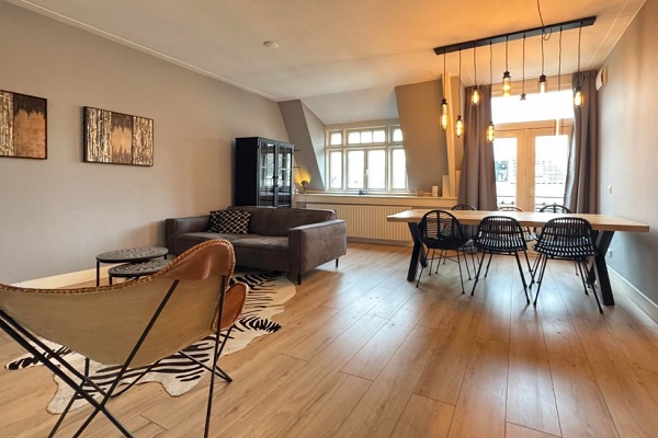 Indeling: Entree van de woning met hal en praktische voorraadkast. Op deze verdieping bevindt zich het woongedeelte. Aan de voorzijde van de woning ligt de ruime en lichte woonkamer met toegang tot een klein balkon. In het midden van de verdieping is een separaat toilet met fonteintje gesitueerd. Aan de achterzijde bevindt zich de halfopen keuken, voorzien van alle benodigde inbouwapparatuur en met directe toegang tot het terras, een ruime slaapkamer, badkamer voorzien van een aparte douche, wastafel met wastafelmeubel en wasmachine. Royaal dakterras, een heerlijke buitenruimte waar je kunt genieten van de buitenlucht, ontspannen in de zon of gezellig kunt borrelen en dineren met vrienden, midden in de stad. Woningdeling is niet toegestaan