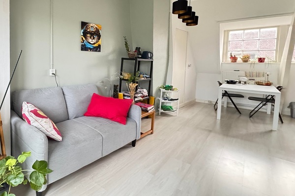 Indeling Bij binnenkomst op de entreeverdieping bevindt zich de badkamer, netjes afgewerkt en praktisch ingericht. Via de trap bereik je de bovenste etage, waar zich de leefruimtes bevinden. Hier vind je een lichte woonkamer met open keuken, een fijne plek om te wonen en te koken. Vanuit de woonkamer is er een deur naar het dakterras, waar je rustig buiten kunt zitten. Op dezelfde etage bevindt zich de ruime slaapkamer, voorzien van een eigen wastafel. Dankzij de indeling en het daglicht voelt deze verdieping open en comfortabel aan. Het dakterras biedt een prettige buitenplek met uitzicht over de omgeving – ideaal voor of een zomerse avond. Geschikt voor een alleenstaande of stel
