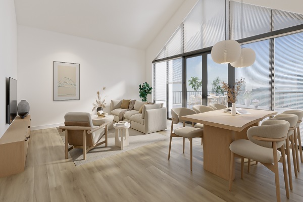 Indeling Via de centrale entree op de begane grond brengt de lift je naar het dakniveau, waar je uitkomt op het gezamenlijke dakterras en de voordeur van de woning. Binnen leidt de hal naar twee slaapkamers, de badkamer, een separaat toilet, een inpandige berging en de lichte woonkamer met open keuken. Vanuit de woonkamer heb je direct toegang tot het dakterras.