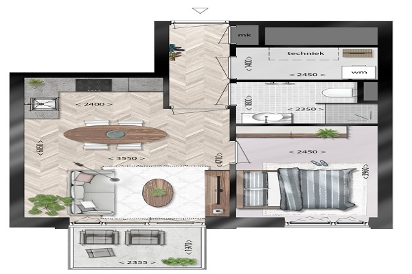 Indeling Je komt binnen in de hal met toegang tot de technische ruimte wat tevens ook als inpandige berging dient.. De woonkamer is voorzien van een moderne keuken die beschikt over inbouwapparatuur, waaronder een inductie kookplaat, combi oven/magnetron, afzuigkap, vries/koelcombinatie en vaatwasmachine. Dit appartement beschikt over een aparte slaapkamer. De badkamer is uitgerust met een wastafel met spiegel, zwevend toilet, glazen douchewand en een handdoekradiator. Daarnaast heb je ook nog een een eigen balkon!