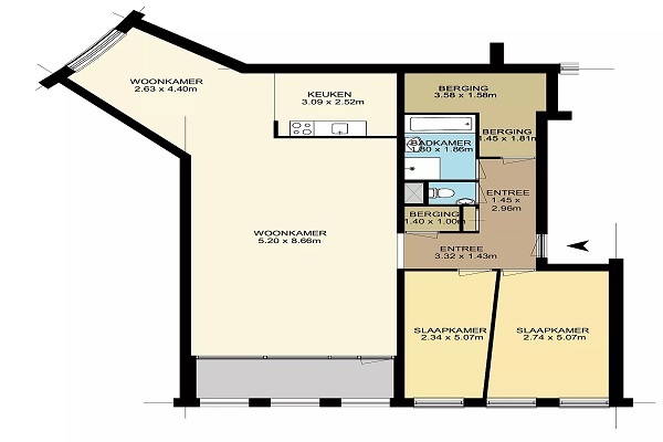 Vanaf de hal betreedt je de ruime woonkamer. de moderne half open keuken is uitgerust met alle benodigde inbouwapparatuur. De woning beschikt over twee slaapkamers, bereikbaar via de hal. De badkamer is volledig compleet met een inloopdouche, spiegel, radiator, planchet en een wastafel. Geniet van je balkon, toegankelijk vanuit de woonkamer. De woning heeft een separaat toilet met een fontein en een inpandige berging.