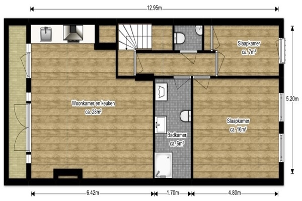 Indeling De voordeur ligt op het straatniveau, via een trap is de woning te bereiken op de tweede etage. De gang geeft toegang tot alle ruimtes van de woning en beschikt over een mooie laminaatvloer. Zo geeft de hal toegang tot de ruime woonkamer aan de achterzijde van de woning. De dubbele deuren geven u toegang tot een balkon. Koken kunt u in de open keuken, voorzien van elektrische kookplaat, vaatwasser, magnetron en RVS-afzuigkap. Aan de straatkant van de woning liggen twee slaapkamers. De master bedroom is ca. 16m2 en voorzien van een wastafel. De tweede kamer is, naast slaapkamer, goed te gebruiken als bijvoorbeeld kantoor of kinderkamer en heeft toegang tot een frans balkon. Het slaap en woongedeelte wordt afgescheiden door een nette badkamer. Deze beschikt over een douche, wastafel, wasmachine aansluiting, design radiator en een tweede toilet. De gang geeft toegang tot een separate toilet met fonteintje.