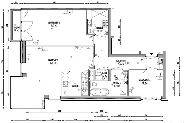 De woonkamer heeft veel daglicht dankzij de grote raampartij. De woonkamer staat in open verbinding met de keuken, De keuken is voorzien van alle inbouwapparatuur die je nodig hebt: een inductie kookplaat met afzuigkap, vaatwasser, koel-/vriescombinatie en een combi-magnetron. Er is daarnaast meer dan voldoende opbergruimte. Het appartement heeft 2 slaapkamers, van 21 m2 en 8,6 m2. Vanuit de grote slaapkamer is het balkon bereikbaar. De badkamer heeft een inloopdouche met glazen wand, ligbad, dubbele wastafel én een toilet. Daarnaast is er nog een separate toiletruimte. In de inpandige berging/wasruimte vind je de aansluitingen voor wasmachine en droger, evenals de duurzame WKO-installatie (Warmte Koude Opslag) die zorgt voor een energiezuinig binnenklimaat. Het appartement beschikt over een eigen parkeerplaats in de afgesloten parkeergarage.