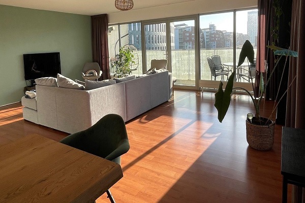 Entree in het appartement in de ruime hal met aansluitend de twee slaapkamer, het toilet de badkamer, de inpandige berging en de ruime woonkamer met open keuken. Woonkamer: Ruime en lichte woonkamer met open keuken. De woonkamer is prettig licht door de grote raampartij en de deuren naar het, op het zuiden gelegen balkon. Keuken: De moderne en keurige open keuken is voorzien van kookplaat, koelkast,, vaatwasser, afzuigkap en een combi-oven/magnetron. Verder vooral veel berg- en fijne kastruimte. Sanitaire: De badkamer is keurig betegeld en voorzien van een inloopdouche en een dubbele wastafel. Het toilet is separaat aansluitend aan de hal gelegen. Slaapkamers: Het appartement heeft twee ruime slaapkamers, beide zijn aansluitend aan de hal gelegen. Vanuit de grootste slaapkamer heb je toegang tot het tweede dakterras. Dit heerlijke terras is op het westen gelegen. Berging: Aansluitend aan de hal vinden een inpandige berging/ technische ruimte in het appartement. Verder op de heeft dit appartement een ruime eigen bering in de kelder van het appartementencomplex. Parkeren: Bij dit appartement heb je ook de beschikking over een eigen parkeerplaats in de parkeergarage onder het gebouw.