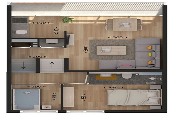 Indeling: •Woonverdieping: Vanuit de hal loop je door naar de woonkamer en de open keuken. De keuken heeft een kookplaat, afzuigkap en een aansluiting voor een vaatwasser. Via de keuken stap je zo het balkon op. •Slaapverdieping: Hier vind je twee slaapkamers en een badkamer met douche, wastafel en toilet. •Begane grond: Je kunt je fiets kwijt in de gezamenlijke fietsenberging.