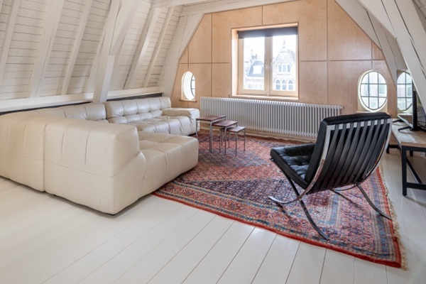 Indeling: Centrale entree en met de trap naar de 2e verdieping, alwaar de ingang tot het appartement is; trapopgang naar de 3e verdieping 3e verdieping: zeer ruime woonkamer met een open industriële keuken (v.v. diverse inbouw apparatuur), apart toilet, trap naar bovenste verdieping 4e verdieping: 2 ruime slaapkamers, met elk een eigen badkamer