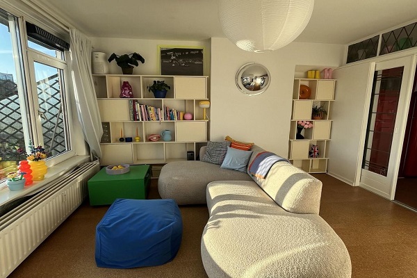 INDELING Begane grond: Centrale entree met bellentableau, brievenbussen en trappenopgang naar de verdiepingen. 4e etage: Bij binnenkomst valt direct de lichte en artistieke sfeer op. De woning is hoogwaardig en met veel oog voor detail ingericht. Woonkamer: Een lichte leefruimte voorzien van grote raampartijen die zorgen voor veel daglichtinval. De inrichting is modern en kleurrijk, met een comfortabele zithoek en unieke designelementen. Keuken: De semi-open keuken is een echte blikvanger met rode accenten en een karakteristieke SMEG-koelkast. De keuken is voorzien van diverse inbouwapparatuur en biedt tijdens het koken een weids uitzicht over de stad. Aangrenzend vind je de eethoek, mooi gepositioneerd bij het raam. Slaapkamer: De ruime slaapkamer is een rustpunt in huis, uitgevoerd in frisse blauwtinten. Er is veel bergruimte dankzij de slimme inbouwkasten/garderobeoplossing. Toilet & Badkamer: Een architectonisch statement: het toilet is volledig uitgevoerd in een gedurfd roze / rood design, voorzien van toilet, wastafel. De badkamer, inloopdouche met wastafel is strak afgewerkt en pas met de gehele kleuren schitterend binnen het geheel van deze stijlvolle woning! Dakterras: De absolute parel van dit appartement is het zeer ruime dakterras. Hier kun je in alle privacy genieten van de zon en het stedelijke uitzicht. Een luxe die zeldzaam is in het hart van de stad!