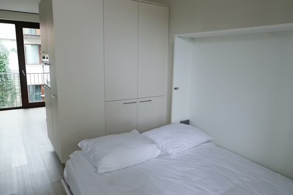 Deze studio, gelegen op de eerste verdieping van het gebouw, is 29 vierkante meter groot en heeft een balkon met uitzicht op de binnentuin. De studio is volledig uitgerust en gemeubileerd met een bed, een bank, een kledingkast, een eettafel en stoelen. Handdoeken en beddengoed zijn ook aanwezig. Het gebouw is zeer duurzaam en milieuvriendelijk. De studio kan zichzelf koelen en verwarmen met de aanwezige airconditioning. De energie hiervoor is afkomstig van de zonnepanelen op het dak. Het ontwerp van deze is zeer modern en stijlvol. Het Scandinavische interieur zorgt voor veel licht in de studio. De ruimte is slim verdeeld door middel van een bed-bureau. Dit meubelstuk functioneert uitgeklapt als bed (160x200 cm) en ingeklapt als bureau om ruimte te besparen.