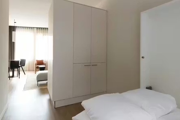 Gelegen op de eerste verdieping van het gebouw, is de studio 41 vierkante meter groot en beschikt over een balkon van 3,3 m². De studio is volledig uitgerust en gemeubileerd met een bed, een slaapbank, een kledingkast, een eettafel en stoelen. Handdoeken en beddengoed zijn ook aanwezig. Het gebouw is zeer duurzaam en milieuvriendelijk. Uw studio kan zichzelf koelen en verwarmen met de geïnstalleerde airconditioning. De energie hiervoor komt van de zonnepanelen op het dak. Het ontwerp van deze accommodatie heeft een zeer moderne aanpak, wat zorgt voor een chique uitstraling. Het Scandinavische interieur zorgt voor veel licht in de studio. De ruimte is slim verdeeld door middel van een bureau-bed. Dit meubelstuk functioneert uitgeklapt als bed (160x200 cm) en ingeklapt als bureau om ruimte te besparen. Stellen zijn welkom, maar het is niet toegestaan om een kamer te delen met een vriend(in).