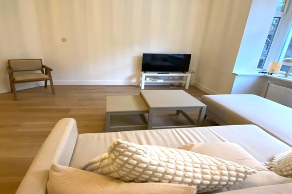 Bij binnenkomst bevind u zich op een ruime etage die is ingedeeld in een woonkamer en slaapkamer. De totale oppervlakte is van de etage ca. 11,5x 3.5/5.5. De woning is voorzien van eigen douche, toilet en keuken. De gehele woning is voorzien van een laminaat vloer met openslaande deuren naar het balkon.