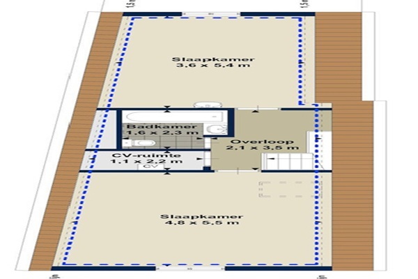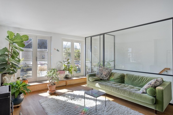 Begane grond Entree met trapopgang. Eerste verdieping Op de eerste verdieping vinden we de royale en sfeervolle woonkamer met open keuken. De woonkamer heeft veel natuurlijk lichtinval door de twee grote, dubbele openslaande deuren naar het royale dakterras aan de achterzijde van de woning. De ruime keuken is voorzien van diverse apparatuur zoals een koelkast, vriezer, vaatwasser en oven. Verder op de eerste verdieping de eerste badkamer met toilet, wastafel en douche. In deze badkamer zijn ook de wasmachine en droger geplaatst. Naast de badkamer is een ruime berging/ kledingkamer gesitueerd. Middels de vaste trap op de eerste verdieping komen we uit op de tweede verdieping. Tweede verdieping Ruime tweede etage met twee ruime slaapkamers. De hoofdslaapkamer is aan de achterzijde van het pand gelegen en deze is voorzien van een tweepersoonsbed. De kamer aan de voorzijde van het pand is ingericht als werkkamer. Het zijn fijne lichte, en door de balklagen, sfeervolle slaapkamers. Naast de twee slaapkamers vinden we op deze etage ook de tweede badkamer met ligbad, tweede toilet en wastafel en de CV-ruimte.
