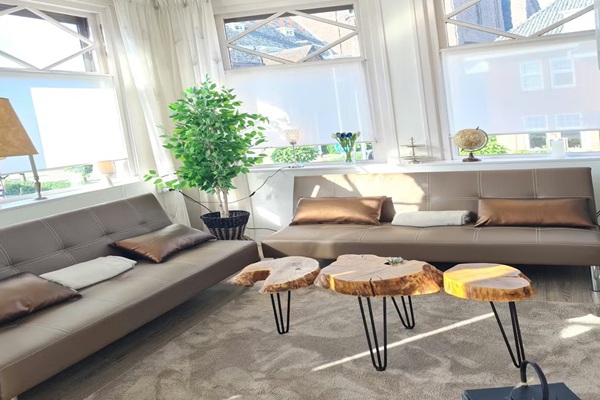 1 tweepersoonsbed + 2 slaapbanken voor het geval er gasten zijn. Het appartement bestaat uit twee verdiepingen (begane grond en de tweede - en bovenste - verdieping), met een eigen ingang met garderobe en meterkast. De begane grond is bereikbaar via de vaste trap. De hal geeft toegang tot een ruime woonkamer, ingericht met een eettafel voor 4 personen met 4 stoelen, 2 slaapbanken, een tv en een sierhaard. Deze kamer is bijzonder licht dankzij zes grote originele schuiframen. Op dezelfde verdieping bevinden zich: een gezellige keuken, volledig uitgerust met een moderne koelkast, vaatwasser, elektrische oven, magnetron, een 4-pits gasfornuis met afzuigkap, en waterkoker, een bartafel voor 4 personen met 4 barkrukken; een wasruimte met wasmachine en droger van de beste en meest energiezuinige energieklasse die momenteel op de markt is; een net toilet. Op de tweede verdieping, bereikbaar via de vaste trap, bevindt zich een slaapkamer voor twee personen, met een kast en twee ladekasten, en directe toegang tot een privébalkon. Dit balkon is voorzien van twee rotan loungesets en planten. Het balkon biedt veel privacy en is een heerlijke plek om buiten te zitten. Op dezelfde verdieping bevinden zich ook een ruime, volledig betegelde badkamer met een ligbad met douche, wastafel, toilet, radiator en mechanische ventilatie; een gang met diverse handige kasten; en de centrale verwarmingsruimte in een afgesloten ruimte. De woning is voorzien van rolluiken op de begane grond en dubbel glas op de eerste verdieping. Op elke verdieping zijn brand- en koolmonoxidemelders en brandblussers aanwezig. Het appartement beschikt over een berging voor afval op de begane grond, aan de overkant van de straat.