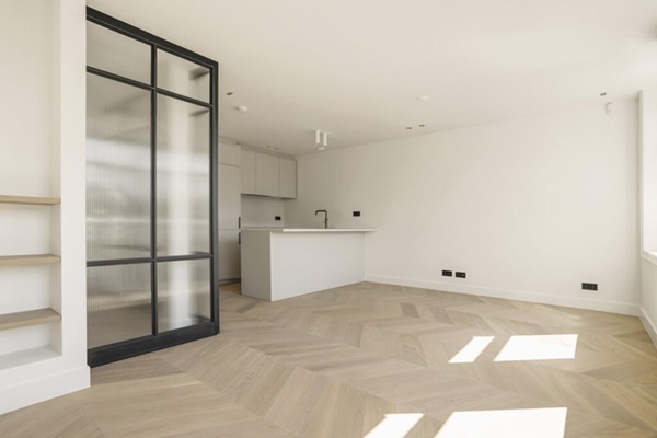 Alle appartementen hebben een hoogwaardige afwerking gekregen en een compleet eigen stijl. De stijl is ontworpen door Heyligers Architects en kan het beste worden omschreven als ‘Amsterdam chic meets Scandinavisch minimalisme’. Een stijl die staat voor veel details, lijstwerk en strakke lijnen, voor natuurlijke materialen, minimalisme en voor serene rust. In de appartementen zijn veel lichte tinten gebruikt, die worden gecombineerd met donkere, stalen puien. In de stalen pui is – in tegenstelling tot normaal, helder glas – geribbeld glas toegepast, wat een bijzondere sfeer creëert. De licht eiken vloer die is gelegd in een Hongaarse punt, de witte paneeldeuren, het lijstwerk rondom de ramen en deuren en de klassieke plinten zorgen voor een luxe uitstraling. In de appartementen is met alles rekening gehouden. Zo zijn deze voorzien van een walk-in closet en van nissen die ruimte bieden aan decoratieve kasten. De keuken is een combinatie van mat lichtgrijze keukenfronten, een dun composiet zandkleurig werkblad met lichte aders waarin de spoelbak doorloopt. Een messing Quooker kraan maakt deze ton-sur-ton keuken helemaal af en zal het een eigen gezicht geven, dat naadloos aansluit bij de sfeer in de rest van het appartement. Waar in het appartement lichte tinten de boventoon voeren, wordt in de badkamer met donkerdere tinten gewerkt. Zo zijn de wanden van de douche en wastafel voorzien van donkere wandtegels. Door deze af te wisselen met een Hongaarse punt en kruisverband, ontstaat een speels effect. Voor de andere wanden en de vloer is gekozen voor witte, keramische tegels met een lichtgrijze ader, die samen met de bronzen kranen voor een chique uitstraling zorgen. Ook in het wastafelmeubel komt het licht-donker contrast terug: licht geribbeld houten lades en een zwart marmeren blad. Het vrijstaande bad, de separate douche en de dubbele wastafel maken het plaatje compleet.