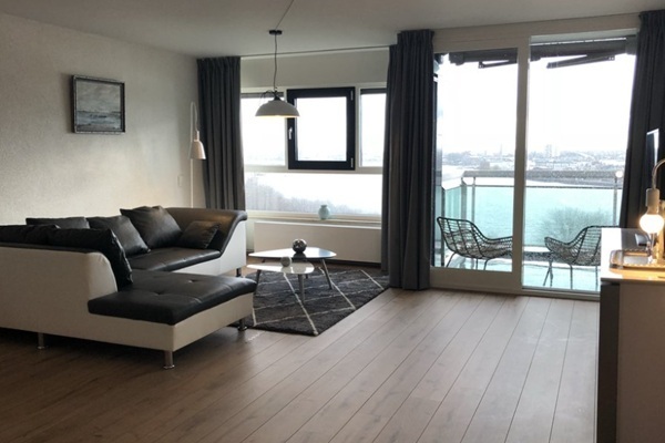 * Helaas kan deze woning niet gedeeld worden, behalve door een koppel, en is deze niet geschikt voor studenten. Aanvragen door studenten en/of woningdelers zullen niet worden behandeld. Indeling: Begane grond Afgesloten entree met bellentableau, mailboxen en liften. Vierde verdieping: Entree, ruime hal, garderobe, praktische afgesloten bergruimte met wasmachineaansluiting. Heerlijk royale lichte woonkamer met uitzicht vol op de Nieuwe Maas, toegang naar zonnig balkon gelegen op het Zuiden. Open keuken, voorzien van alle gemakken en volledig vernieuwd, met toegang naar tweede balkon gelegen op het Noorden. Badkamer met ruime inloop douche en dubbele wastafel. Slaapkamer I Slaapkamer II