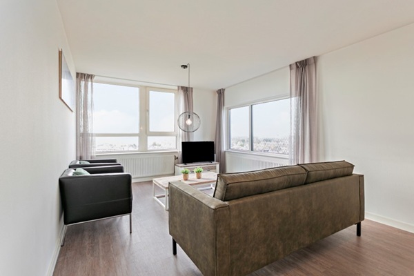 Indeling Begane grond Representatieve en royale entree met stijlvolle afwerking. Het gebouw beschikt over toegangsbeveiliging via videofoon, een nette ontvangsthal en directe toegang tot de liften, het trappenhuis en de afgesloten parkeergarage. 14e verdieping Bij binnenkomst treft u een ruime entree met garderobe en separaat toilet. De royale woonkamer is smaakvol ingericht met een comfortabele zithoek en een ruime eethoek. Dankzij de grote raampartijen geniet u hier van een indrukwekkend uitzicht over Eindhoven. De luxe halfopen keuken is volledig uitgerust met hoogwaardige inbouwapparatuur, waaronder een vaatwasser, oven-grill-magnetron, gaskookplaat en een koel-vriescombinatie. Aangrenzend bevindt zich een praktische berging met wasmachine en droger. Het appartement beschikt over twee slaapkamers: Een ruime hoofdslaapkamer met een queen-size tweepersoonsbed en een tweede slaapkamer met een comfortabel eenpersoonsbed De luxe badkamer is compleet uitgevoerd met een separate douchecabine en vaste wastafels.