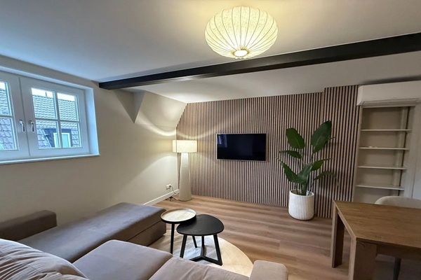 INDELING: Eerste verdieping: -Overloop met toegang tot de woonkamer, badkamer en trapopgang naar de tweede verdieping.- Woonkamer met strak gestucte wanden, houtlook vloer en grote raampartijen voor een aangename lichtinval.- Keuken in luxe hoekopstelling, voorzien van een inductiekookplaat, afzuigkap, koelkast, diepvries en combi-oven. - Badkamer met inloopdouche, hangcloset,en wastafel met meubel. Tweede verdieping:- Ruime slaapkamer met karakteristieke houten balken, pvc-vloer en veel daglicht dankzij Velux dakvenster aan één zijde Geschikt voor studenten