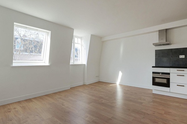 Via een gedeelde portiek kom je met d etrap naar de vierde verdieping. De woonkamer van bijna 25m2 oppervlakte, heeft een open keuken welke is voorzien van diverse inbouwapparatuur zoals een inductiekookplaat, koel-vriescombi, combimagnetron, vaatwasser en een afzuigkap. De slaapkamer is ongeveer 15m2 in oppervlakte. De badkamer heeft een wastafel en een douche. Er is een apart toilet met fonteintje. Via een trap in de hal kom je op het dakterras. Dakterras heeft een oppervlakte van 14m2.