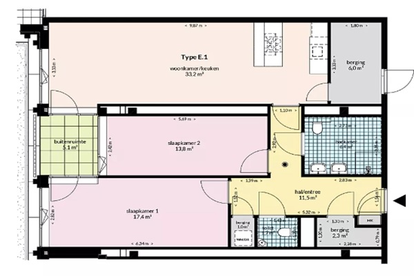 Het appartement is gelegen aan de mooi aangelegde binnentuin, wat zorgt voor rust. Vanuit de woonkamer kijk je uit op de tuin en heb je tevens toegang tot het balkon. Er is een open keuken met een kookeiland. De keuken is voorzien van een vaatwasser, inductiekookplaat met afzuigkap, combi-magnetron en een koel-vriescombinatie. Er zijn 2 slaapkamers, van 17,4 en 13,8 m2. Beide slaapkamers kijken ook uit op de tuin. Ook de grote slaapkamer geeft toegang tot het balkon. De badkamer heeft een inloopdouche, dubbele wastafel en een tweede toilet. Er is tevens een separaat toilet. Er is meer dan voldoende bergruimte. Naast de keuken ligt een ruime berging. Er is een berging met de warmtepomp en de WTW-installatie en tevens is er een wasruimte. Het appartement wordt opgeleverd met een PVC-vloer.