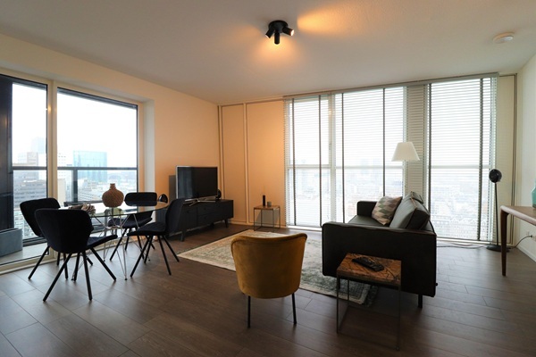 Indeling Hoofdingang met receptie; receptionist 24/7 aanwezig!, brievenbussen, deurbellen en liften. 17e verdieping: entree met hal, apart toilet met wastafel. Lichte woonkamer met toegang tot het balkon, Sonos-systeem, open en moderne keuken (volledig uitgerust) en aparte berging met wasmachine en droger. Master bedroom met Auping-bed, kledingkast en flatscreen. Tweede slaapkamer met kledingkast. Badkamer met wastafel en inloopdouche. • Maximaal 2 huisgenoten • Geen studenten