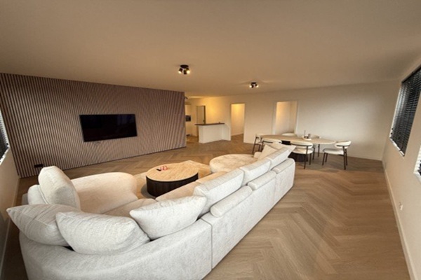 Via de begane grond bereik je de praktische entree met ruimte voor fietsen, een extra vriezer en een eigen wasmachine en droger. Hier is duidelijk nagedacht over gemak en functionaliteit voor zowel kort als langer verblijf. De trap leidt naar de eerste verdieping, waar je binnenkomt in een verzorgde hal met toegang tot alle vertrekken. De separate toiletruimte is modern afgewerkt en voorzien van een fonteintje. De ruime badkamer beschikt over een dubbele wastafel met grote spiegel, een royale inloopdouche met regendouche en stijlvolle natuursteenlook tegels, wat zorgt voor een luxe gevoel in huis. De grote open woonkamer vormt het hart van het appartement. Dankzij de brede raampartijen met strakke jaloezieën is er een prachtige lichtinval en een prettige, rustige sfeer. De ruimte is ingericht met een royale designhoekbank, een vloerkleed, en een stijlvolle eethoek met comfortabele stoelen. De cinema wall met geïntegreerde televisie geeft de ruimte extra karakter en warmte. De open keuken sluit naadloos aan op de woonkamer en is uitgevoerd in strak wit met een donker werkblad. Deze is volledig uitgerust met een combi-oven/magnetron, koelkast, inductiekookplaat, vaatwasser en veel kastruimte. De gezellige bar biedt een fijne plek voor ontbijt, borrel of informeel diner. Het appartement beschikt over drie slaapkamers, waarvan één is ingericht als luxe master bedroom met gestoffeerd hoofdbord en opbergpoef, en één als praktische kastenkamer of thuiskantoor. Ook hier is gekozen voor rust, comfort en een hoogwaardige uitstraling. Overal in de woning is vloerverwarming aanwezig, wat zorgt voor een aangenaam binnenklimaat in alle seizoenen.