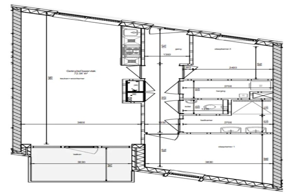 INDELING APPARTEMENTEN -Bellentableau met brievenbussen; -Trapopgang of lift naar verdiepingen. -Entree; -Hal met voldoende ruimte voor garderobe; -Meterkast; -(Deels) betegelde toiletruimte met toilet en fonteintje; -Berging met aansluiting wasapparatuur; -Nette keuken voorzien van diverse inbouwapparatuur van het merk Siemens waaronder koelkast, combimagnetron, inductiekookplaat met 4 kookzones, recirculatie afzuigkap en vaatwasser; -Woonkamer met toegang tot het balkon; -Betegelde badkamer voorzien van vaste wastafel en inloopdouche; -Slaapkamer 1; -Slaapkamer 2.