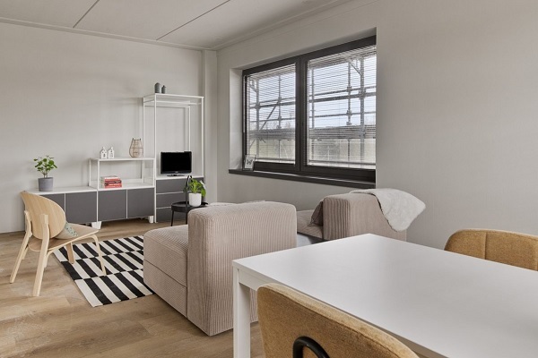 Het appartement is 48 m² groot en heeft een slimme indeling. Als je het appartement betreedt stap je de hal binnen. Hier is de deur naar je eigen luxe badkamer met toilet, wasmeubel en douche. Aan het einde van de hal bevindt zich de open keuken, voorzien van een koelkast en een kleine kookplaat. De woonkamer heeft grote ramen die voor lekker veel licht zorgen. En het uitzicht is overal prachtig. Naast de woonkamer vind je de ruime slaapkamer, groot genoeg voor een bed en een flinke kledingkast. Door het hele appartement ligt al een pvc vloer en alle ramen zijn voorzien van raambekleding. Kwestie van verhuizen!