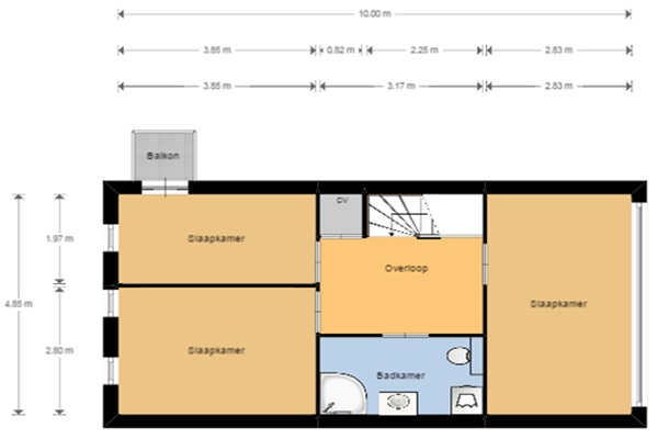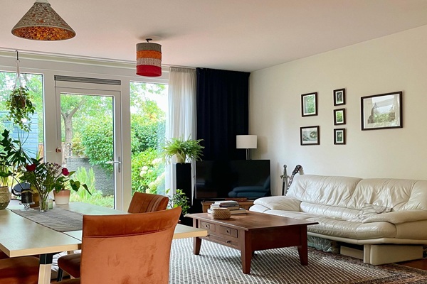 Indeling Entree, ruime hal ca. 2.20x1.42, meterkast, modern toilet, aan de voorzijde gesitueerde halfopen keuken ca. 4.15x2.40 in L-opstelling voorzien van een werkblad, inbouwapparatuur (vaatwasser, combimagnetron oven en gaskookplaat) en wasemkap, ruime tuingerichte woon-/eetkamer ca. 5.75x4.85 over de volle breedte van de woning met toegang tot de mooie en ruime, ca. 9 meter diepe zonnige achtertuin met vrijstaande houten schuur en achteringang. Ruime overloop, nette badkamer voorzien van douche, wastafel en 2e toilet, ruime en lichte voorkamer 4.85x2.81, ruime achterkamer 3.88x2.77, achter-zijkamer ca. 3.88x2.01 met deur naar balkonnetje.