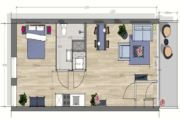 Indeling: Via de entree kom je loft binnen. De woonkamer staat in open verbinding met de keuken en de slaapkamer. Vanuit de woonkamer kijk je uit op het brede balkon met over de gehele breedte hoge ramen. Dit zorgt voor veel licht in de woning. In het midden van de woning is een blok geplaats met daarin de badkamer voorzien van toilet, wastafel en inloopdouche en de interne berging met de wasmachineaansluiting. Dit blok schermt de slaapkamer een beetje af van de overige ruimtes wat zorgt voor de gewenst privacy. Tegenover de badkamer is het keukenblok geplaats. Het appartement is voorzien van een PVC vloer en is dus instap-klaar.