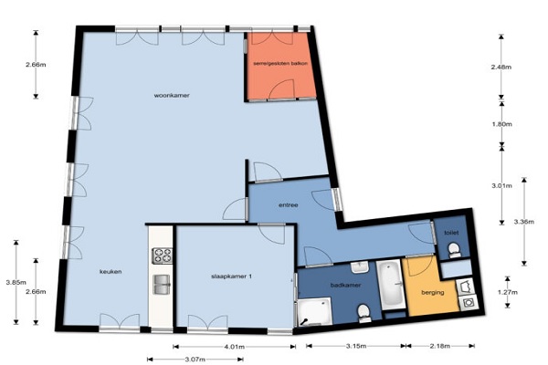 Indeling: Hal met toegang tot badkamer met bad, douche, wastafel en toilet, berging, 1 slaapkamer, separaat toilet en woonkamer met luxe open keuken welke is voorzien van diverse inbouwapparatuur, zoals een kookplaat. oven, vaatwasser en koel/vriescombinatie.