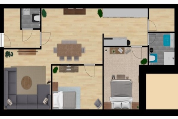 Indeling: Begane grond: entree/ hal, toilet, zeer ruime woonkamer met open keuken voorzien van koelkast, magnetron, kookplaat, afzuigkap en vaatwasser aansluiting, badkamer voorzien van douche, twee wastafels en toilet, bijkeuken met witgoed aansluiting, twee slaapkamers.