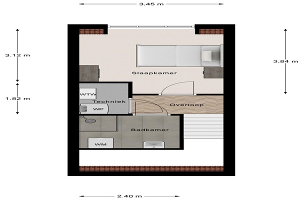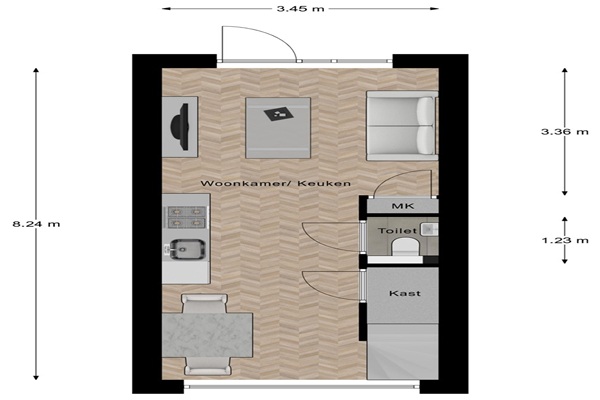 Indeling De woning is toegankelijk via het centraal plein aan de achterzijde. De tuin wordt volledig in het hard opgeleverd, waardoor je geen onderhoud hebt en altijd geniet van een nette uitstraling. Wil je toch wat groen? Dan is er volop ruimte om plantenbakken te plaatsen en de tuin naar eigen smaak op te fleuren. De erfafscheiding bestaat uit een gaashekwerk met hedera. In de tuin bevindt zich tevens een eigen externe berging, ideaal voor het opbergen van fietsen, tuingereedschap of andere spullen. Zo vormt deze buitenruimte een prettige en uitnodigende entree naar de woning. Met een woonoppervlakte van 52 m² beschikt de woning over een slimme indeling die optimaal gebruik maakt van de beschikbare ruimte. Op de begane grond bevindt zich een lichte woonkamer met open keuken. De keuken is uitgerust met een een inductiekookplaat, koelkast, afzuigkap, wasbak en een aansluiting voor een vrijstaande vaatwasser en een aansluiting voor een oven/magnetron. Er is voldoende ruimte voor een gezellige eet- en zithoek. Verder vind je op de begane grond een apart toilet, een bergkast en een meterkast. Op de eerste verdieping kom je uit op een overloop met toegang tot de slaapkamer en de badkamer. De slaapkamer bevindt zich aan de achterzijde van de woning en is dankzij de grote raampartij in het dakkapel een bijzonder lichte en aangename ruimte welke functioneel ruimte geeft aan een bed tot 1,40m breed. De kamer biedt voldoende mogelijkheden voor het plaatsen van een tweepersoonsbed en een kledingkast. De badkamer is praktisch ingericht en beschikt over een douche met douchestang, een wastafel met spiegel én een aansluiting voor een wasmachine en/of droger. Zo heb je alle wasvoorzieningen handig op één plek. Direct naast de badkamer ligt de technische ruimte, waar de warmtepomp en het WTW-systeem zijn geplaatst. Deze installaties zijn netjes weggewerkt maar goed bereikbaar voor onderhoud. De woningen zijn gelegen aan de Doornboomstraat, een gezellige en levendige straat met diverse voorzieningen in de directe omgeving. Supermarkt Jumbo en meerdere bevinden zich op loopafstand, waardoor alle dagelijkse gemakken binnen handbereik zijn. Ideaal voor alleenstaanden of stellen die zelfstandig willen wonen in een rustige, nette en toekomstgerichte woonomgeving.